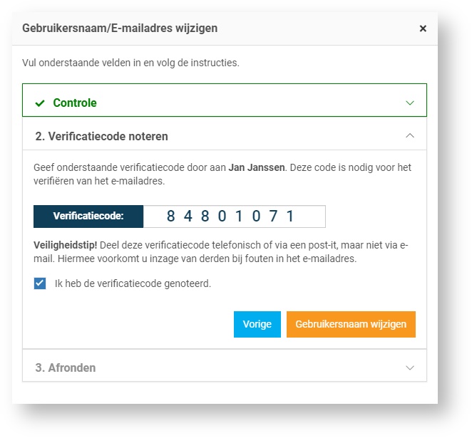 Noteer de verificatiecode en geef deze door aan de beheerder. Vink het vakje ‘Ik heb de verificatiecode genoteerd’ aan en klik op Gebruikersnaam wijzigen.