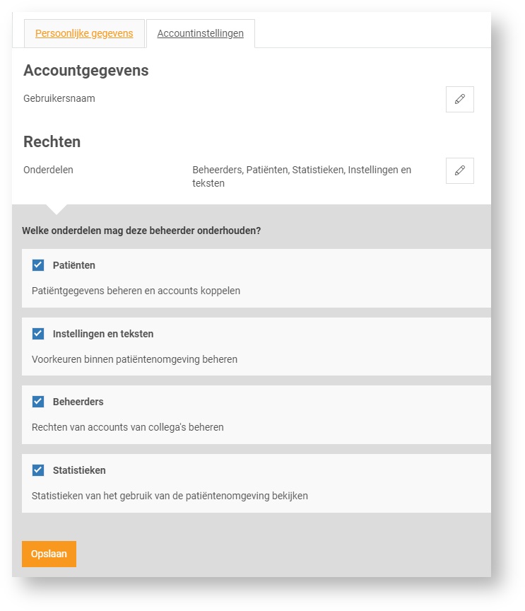 Klik op de beheerder die u wilt bewerken, klik op Accountinstellingen en klik op het potloodje bij Rechten om deze aan te passen.