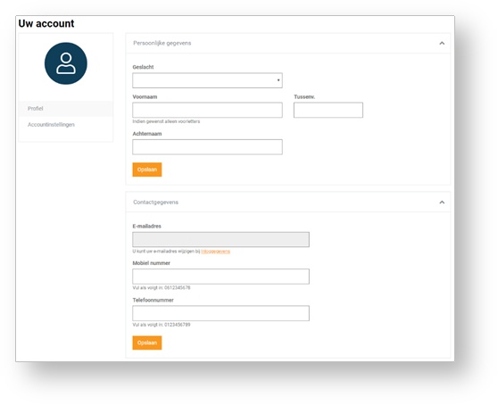 Kiest u voor Uw account dan komt u bij uw profieloverzicht met uw persoonlijke- en contactgegevens.