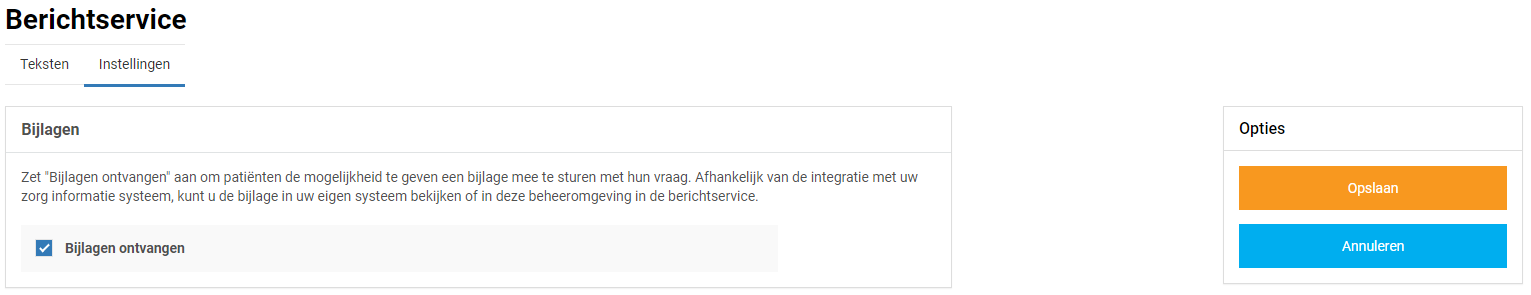 In het tabblad Instellingen kunt u aangeven of patiënten bijlagen met het consult mogen meesturen.