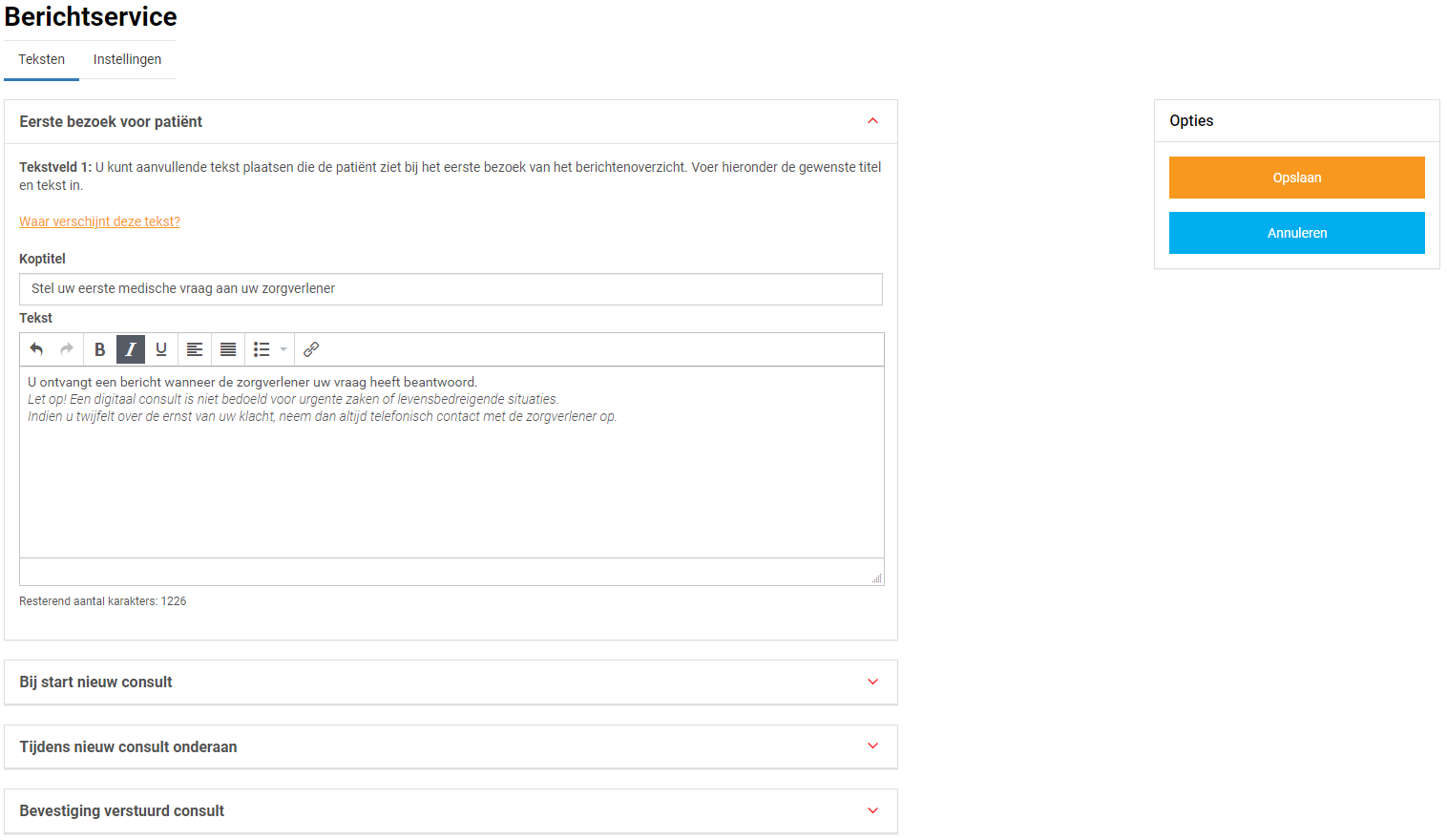 In het tabblad Teksten kunt u per rubriek teksten naar wens aanpassen en bekijken waar deze voor de patiënt zichtbaar zijn.