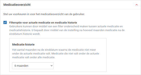 Met de instelling medicatieoverzicht kunt u patiënten de mogelijkheid geven om met behulp van een filter onderscheid te maken tussen actuele medicatie en medicatiehistorie. U bepaalt wanneer medicatie onder medicatiehistorie valt. Bijvoorbeeld medicatie wordt historie 6 maanden na de einddatum.