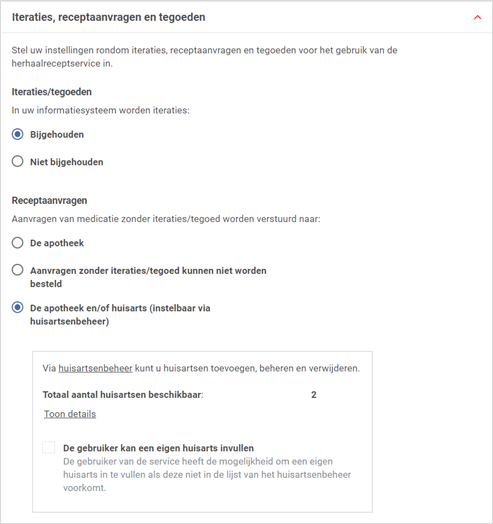 Hier stelt u in of iteraties en tegoeden wel of niet worden bijgehouden. Kiest u ervoor om receptaanvragen zonder iteraties en tegoeden naar de huisarts te sturen, stel dan ook de logistiek in het Huisartsenbeheer in.