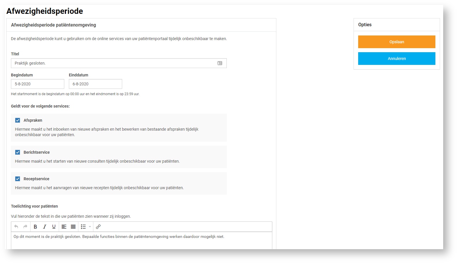 Vul een toelichting in om patiënten over de afwezigheidsperiode te informeren. Deze toelichting verschijnt in de app en in de patiëntenomgeving wanneer de patiënt inlogt.