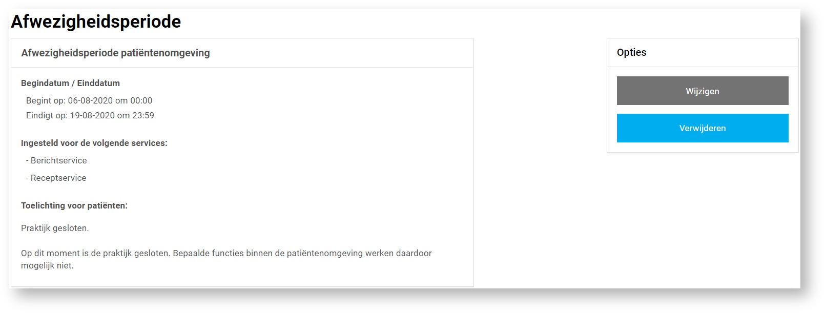 Zodra de Afwezigheidsperiode wordt uitgeschakeld zullen in de app en in de patiëntenomgeving alle services weer actief zijn.