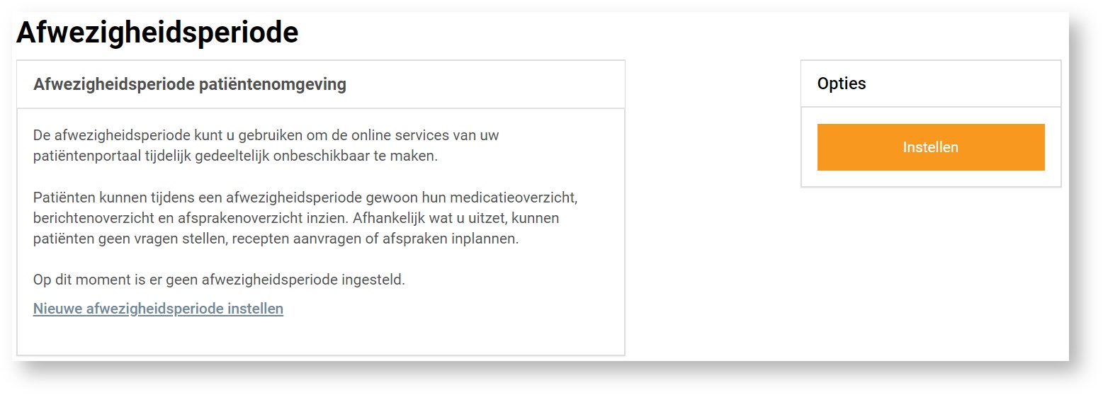 Tijdens de afwezigheidsperiode is het mogelijk een aantal online diensten binnen uw patiëntenomgeving tijdelijk niet beschikbaar te maken. De instellingen die u kiest rond uw afwezigheid worden voor gebruikers zowel in de patiëntenomgeving als in de app van toepassing.
