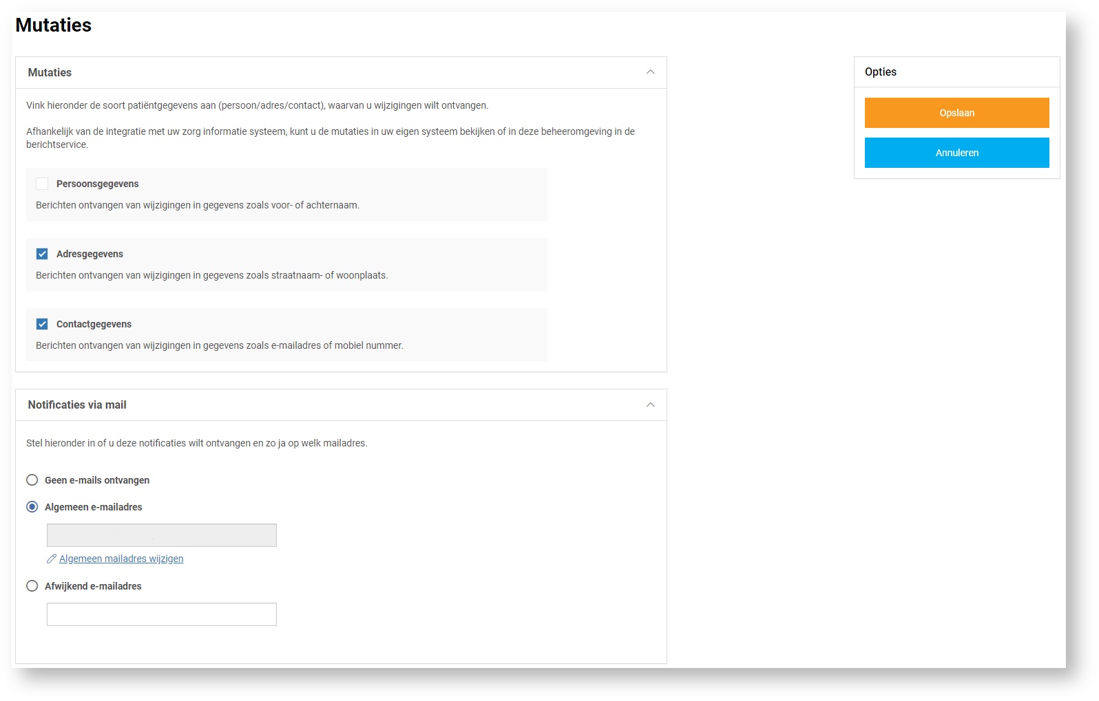 In het scherm dat verschijnt kunt u aangeven of u een bericht wilt ontvangen op het moment dat een patiënt wijzigingen doorvoert in zijn adres of contactgegevens.