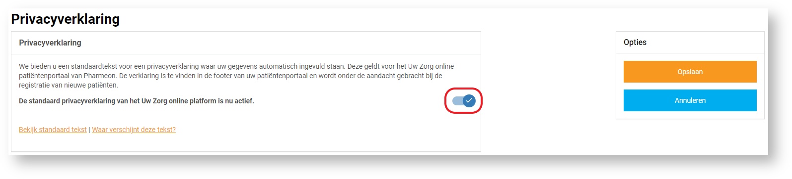 Let op! Indien u de standaard privacyverklaring deactiveert, dan betekent dit dat uw juridische gegevens zoals KvK-, BTW- & BIG nummers niet automatisch meer worden meegenomen in de tekst en dat eventuele inhoudelijke wijzigingen in de standaard tekst niet worden meegenomen.