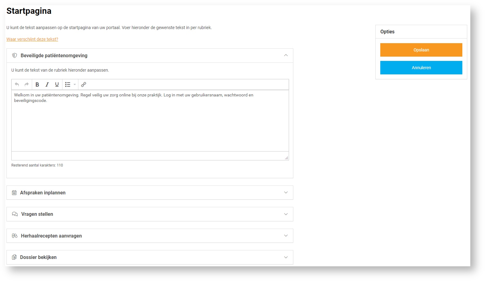 U ziet het scherm waarmee de tekst(en) op de startpagina van de patiëntomgeving per rubriek naar wens aan te passen zijn.
