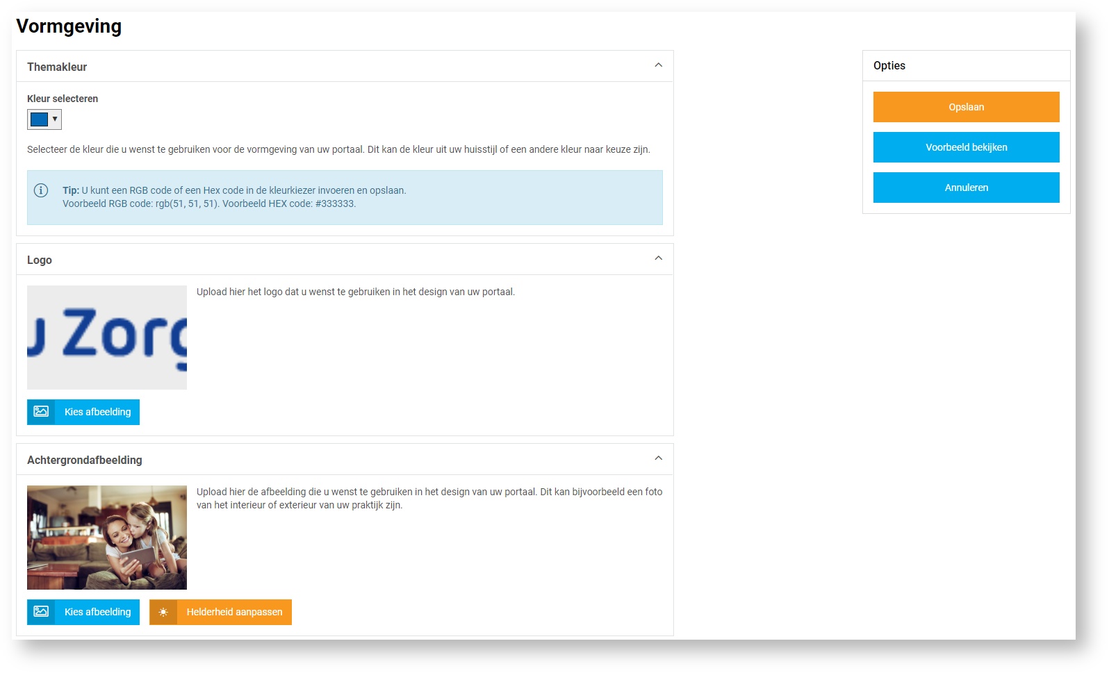 Om de patiëntomgeving volledig aan te laten sluiten bij uw praktijk is het mogelijk om naast het aanpassen van de teksten ook de vormgeving van de patiëntomgeving aan te passen.