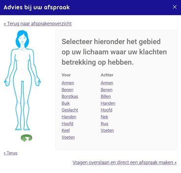De triage functionaliteit kan worden geïntegreerd in uw webagenda service. Patiënten beantwoorden enkele vragen over hun klacht voordat zij een afspraak maken.