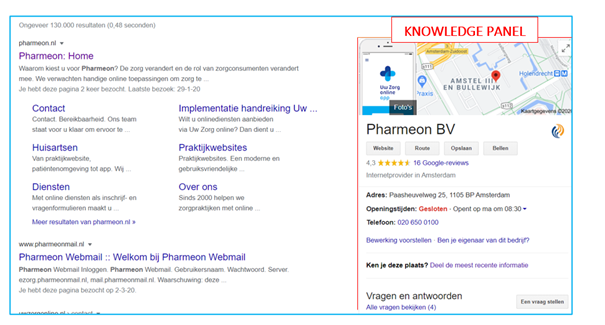 Daarnaast heeft Google een functionaliteit waarmee rechts naast de zoekresultaten informatie wordt getoond over de praktijk. Indien in deze functionaliteit de informatie incorrect is, dan kunt u een bewerking voorstellen. U dient hiervoor wel in te loggen met uw Google-account.