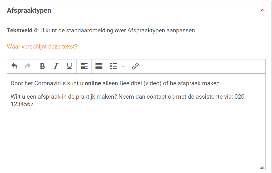 • Een vaste, niet aan te passen tekst (blauw kader) die aangeeft welke afspraaktypen gemaakt kunnen worden.